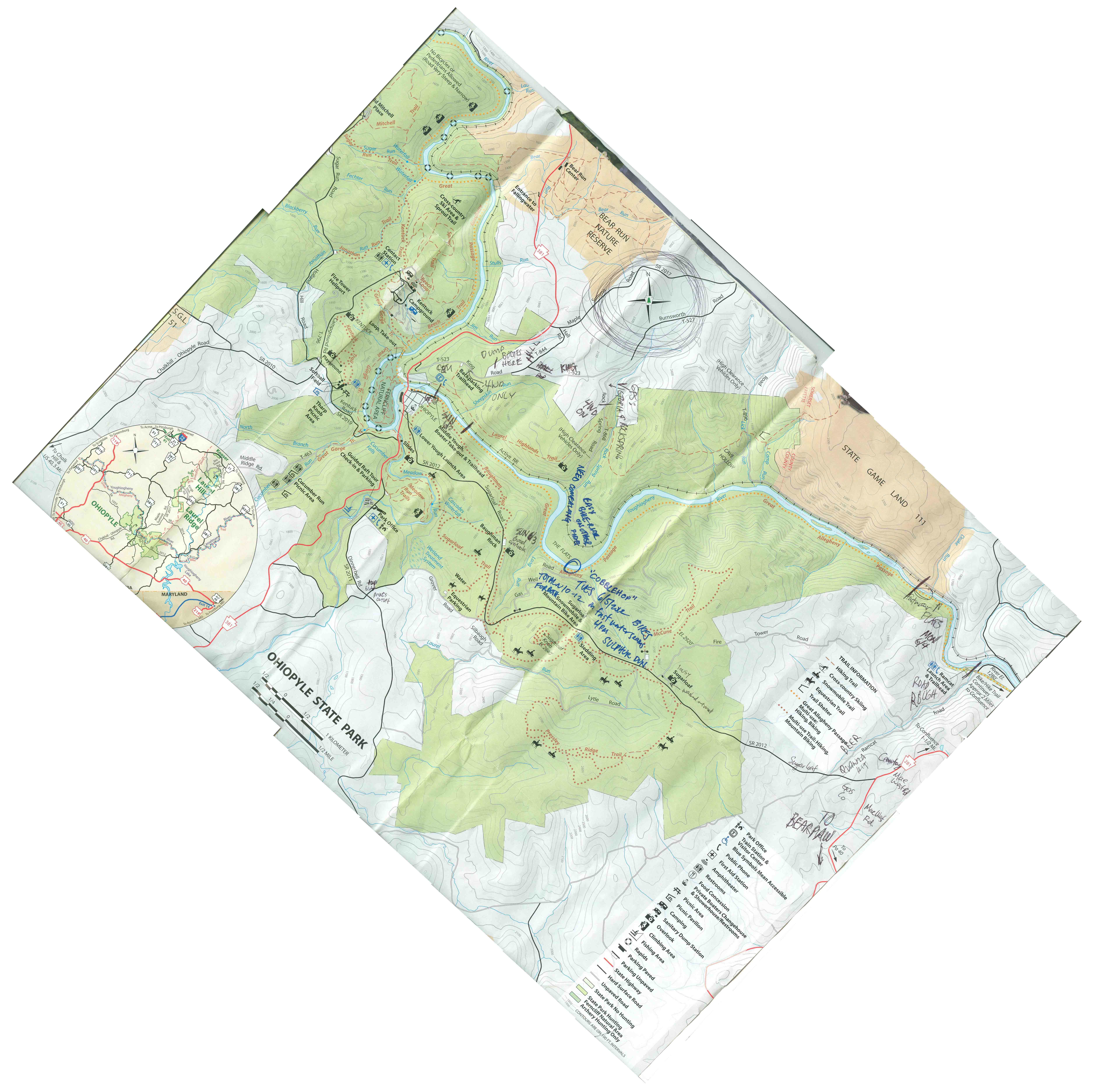 my Ohiopyle with notes rotated to North cobblehop shown slightly east of actual location, it is actually just upstream of Long Run confluence