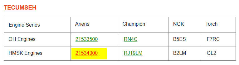 this spark plug cross reference page shows this table, so I probably have Tecumseh HMSK Engine